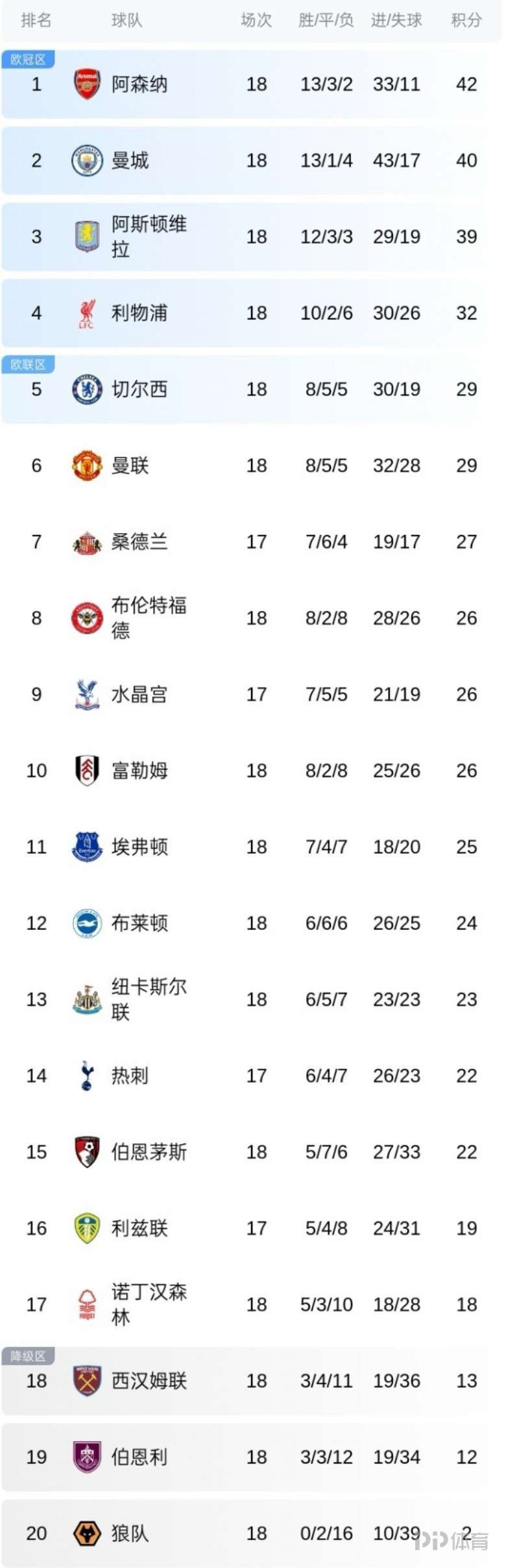 英超积分榜:阿森纳2分优势领先曼城 红军蓝军红魔4-6位