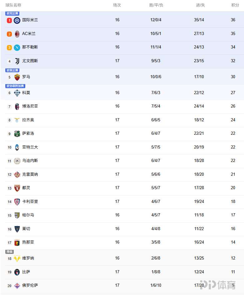意甲积分榜:国米1分优势登顶!米兰第2那不勒斯第3,尤文第4