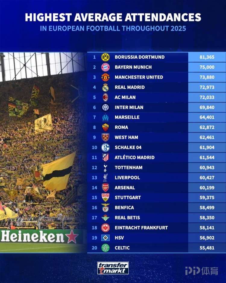 - 2025-12-30 01:36 2025年欧洲俱乐部场均上座数排行:多特第1、拜仁第2、曼联第3